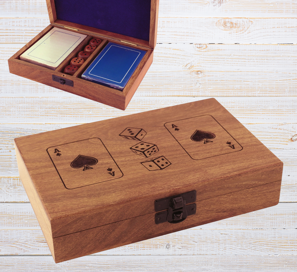 Doppeltes Kartenspiel+ Würfel in Holzbox mit Klappdeckel und Lasergravur - Spielkartenbox