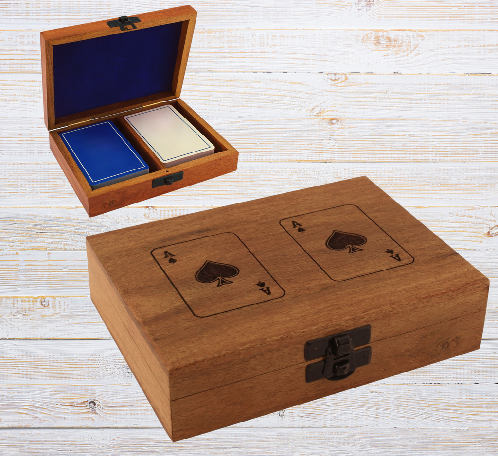 - Edel und dekorativ- Doppeltes Kartenspiel in Holzbox mit Klappdeckel und Lasergravur verziert. Maße 15x 11x 4 cm. Natürlich Neuware und eine super Geschenkidee!