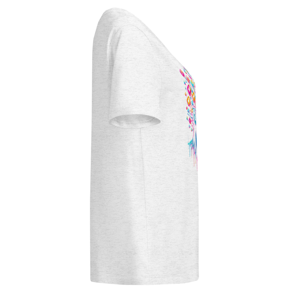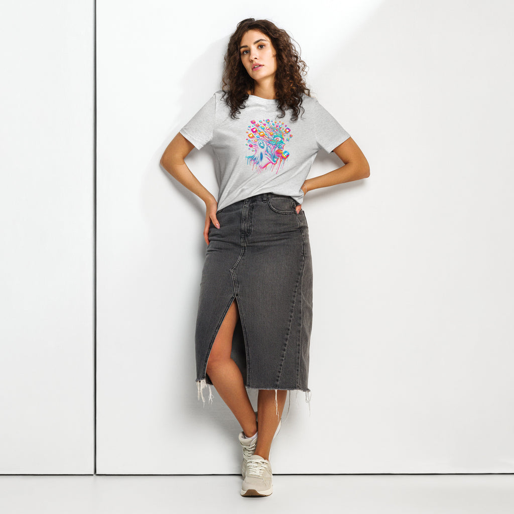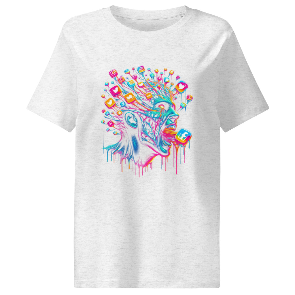 Tauche ein in das Chaos der digitalen Welt mit diesem psychedelischen T-Shirt-Design, das den Informations-Overload und die Mediensucht darstellt. Ein Must-have für Cyberpunk- und Kunstliebhaber.